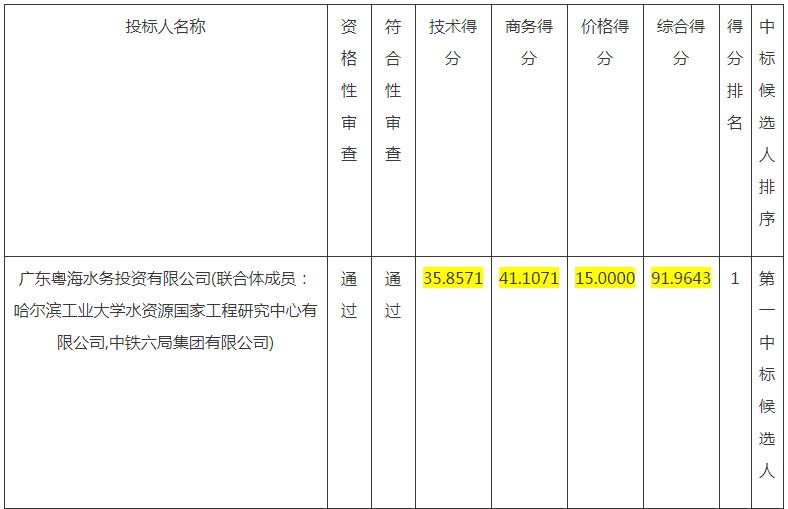 四、中标社会资本名称:广东粤海水务投资有限公司(牵)、哈尔滨工业大学水资源国家工程研究中心有限公司(成)、中铁六局集团有限公司(成)