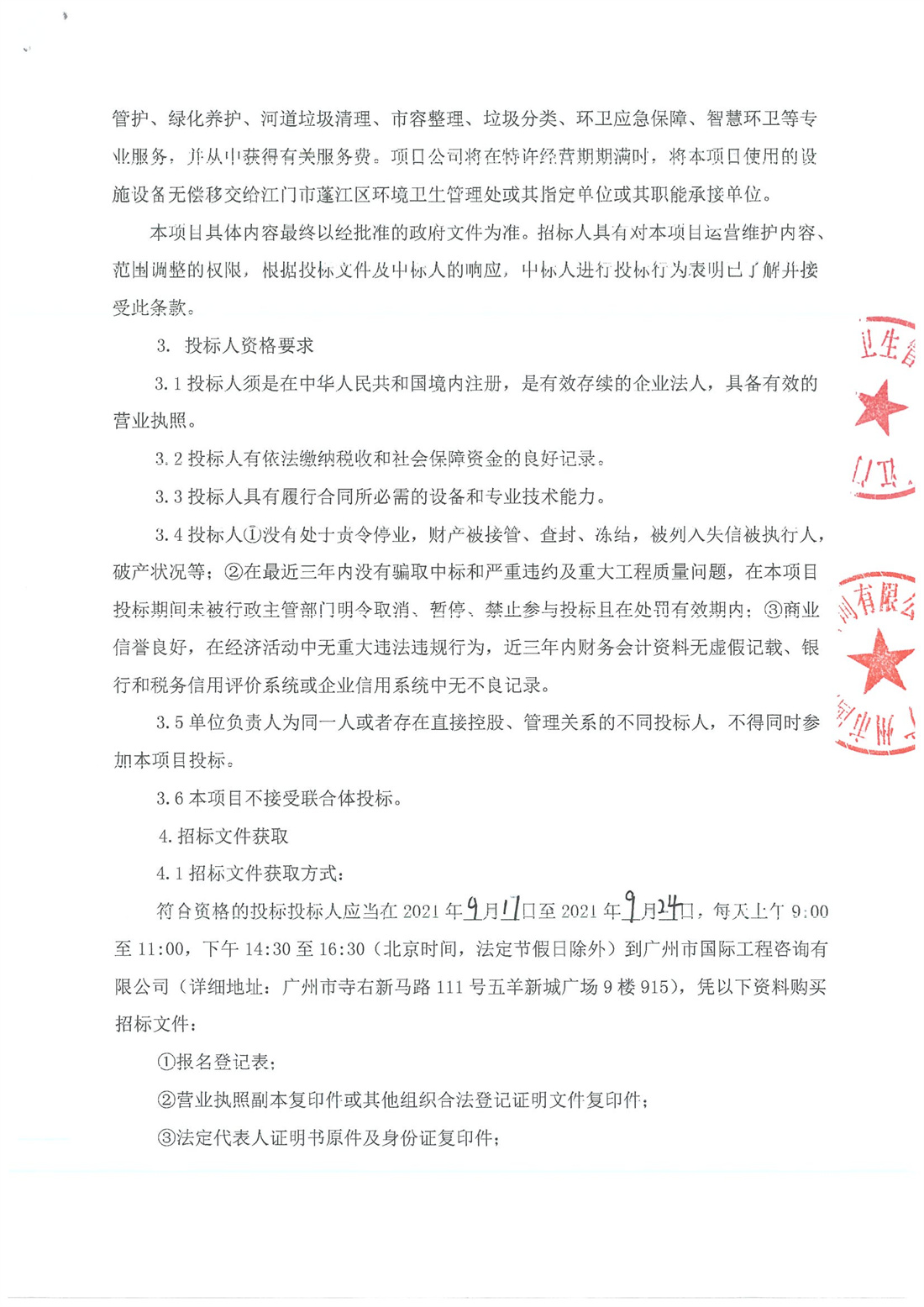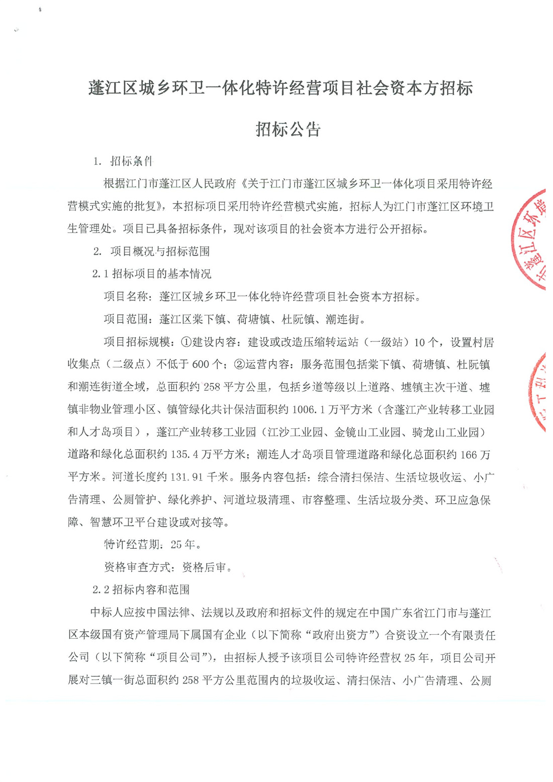 广东江门市蓬江区城乡环卫一体化特许经营项目社会资本方公开招标,该项目投资估算为35亿人民币。