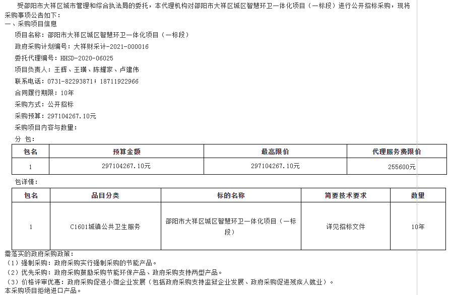 北极星固废网获悉,4月2日,湖南省公共资源交易服务平台发布了邵阳市大祥区城区智慧环卫一体化项目招标公告,项目金额合计约5.51亿元,服务期10年。项目分为2个标段:一标段预算金额约为2.97亿元;二标段预算金额约为2.54亿元。