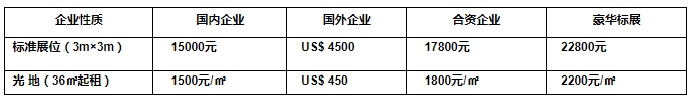 ②标准展台:中英文楣板、9㎡地毯、长桌1张、折椅2把、射灯2只、220V插座1支、纸篓1个.