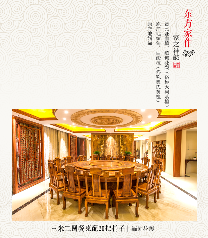 东方古典采用原材料为越南黄花梨、印度小叶紫檀、大红酸枝、缅甸花梨、赞比亚血檀等珍贵木材,以中式红木家居整体设计理念,中式家居生产、销售、服务、红木全屋定制于一体的综合型企业。集五大品牌:东方国作、东方家作、东方仙作、东方作、东方云作。融入现代人的生活和审美习惯,注入传统的古典元素,将中国传统文化韵味与现代时尚品味融合。由资深设计团队精心设计,携余元俊大师精雕细琢、结构精巧、舒适典雅,打造“仙作” 精品,为“仙作” 艺术家具传承与发展而贡献一己之力。