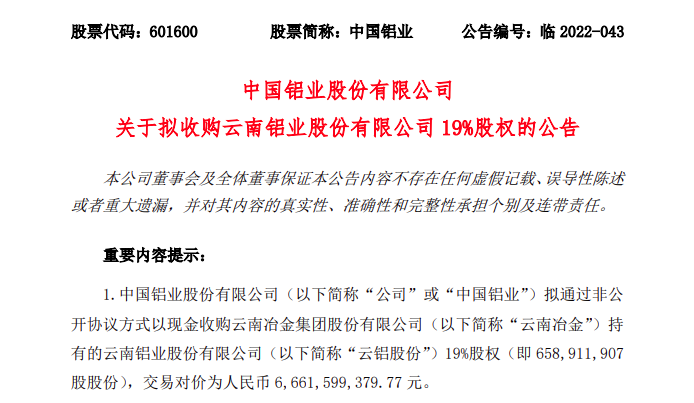 7月24日晚间,云铝股份发布公告称,公司控股股东云南冶金集团股份有限公司(以下简称“云南冶金”)拟通过非公开协议方式将其所持有公司6.59亿股无限售流通股股份转让给中国铝业,占云铝股份总股本的19%,本次转让价格为10.11元/股,转让总价为66.62亿元。交易完成后,中国铝业将成为云铝股份控股股东;公司穿透后的间接控股股东仍为中铝集团,实际控制人仍为国务院国有资产监督管理委员会。