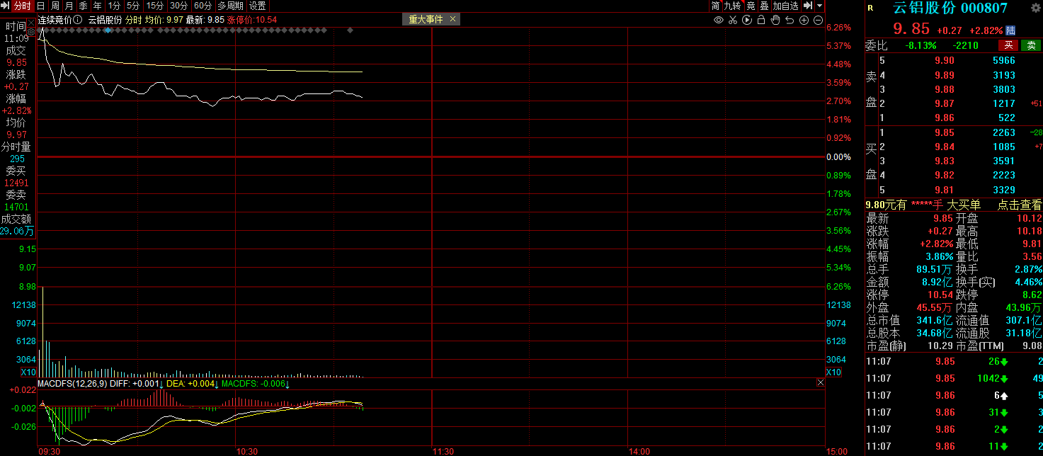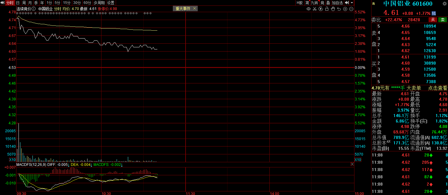 截至发稿,中国铝业涨幅达1.77%,市值789.9亿元;云铝股份涨幅达2.82%,市值341.6亿元。