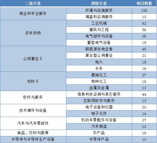 绿色投资项目中,标明行业属性的1155个,按wind行业标准分类,主要集中在商业和专业服务、资本货物、公用事业Ⅱ、材料Ⅱ、软件与服务五个二级行业,占比超过了80%。标明四级行业归属的项目1136个,主要集中在装备制造、工程建设、环保设施运营与服务、新能源发电、新能源汽车、公用事业等领域。