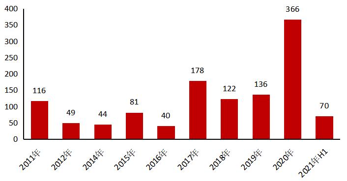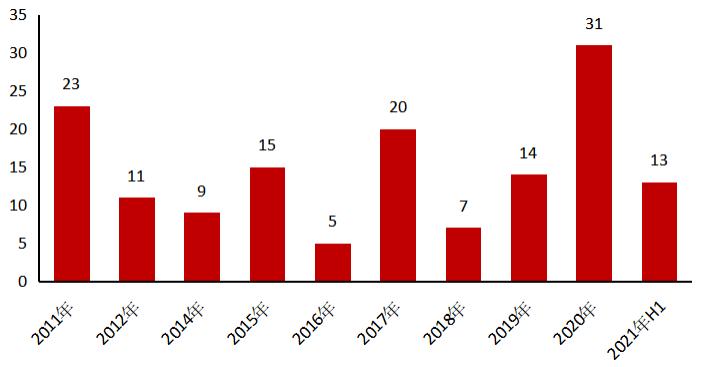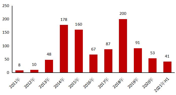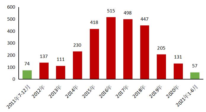 2015-2018年是绿色投资的高峰期,2019年之后逐年下滑,2021年1-6月共57起。