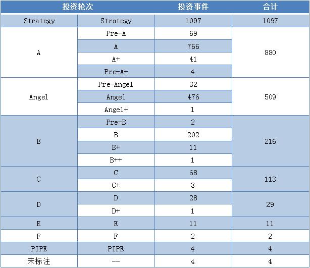 战略投资占比最高,共1097次,占比39.9%,其次为A轮投资,共880次,占比31.2%,再次是天使轮投资,共509次,占比18.0%,最后是B轮投资,共216次,占比7.7%。C轮以上合计113次,占比4%。