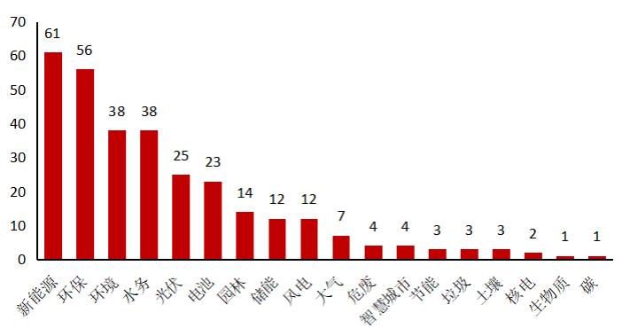 新能源主要集中于设备、原材料、制造、发电、储能等领域,其中,又以设备类最多。环保类则以环保工程与服务为主,占比约60%,其余为设备等。