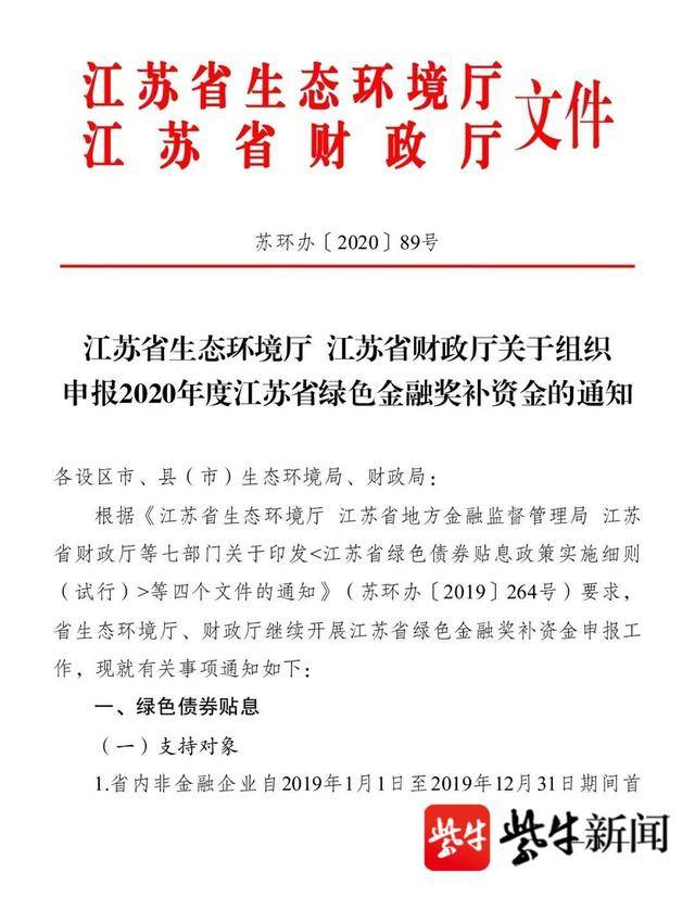 3月25日,记者从江苏省生态环境厅获悉,省生态环境厅、财政厅日前印发《关于组织申报2020年度江苏省绿色金融奖补资金的通知》(以下简称《通知》)。根据《通知》,2020年度江苏省绿色金融奖补资金已经开始了。奖补资金可分为绿色债券贴息、绿色产业企业发行上市奖励、环境污染责任保险保费补贴和绿色担保奖补四种类型。