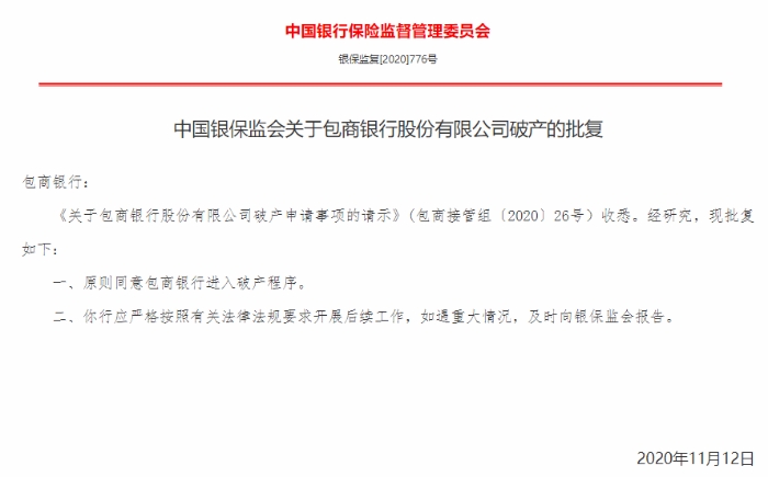 11月23日,中国银保监会发布关于包商银行股份有限公司破产的批复称,原则同意包商银行进入破产程序。