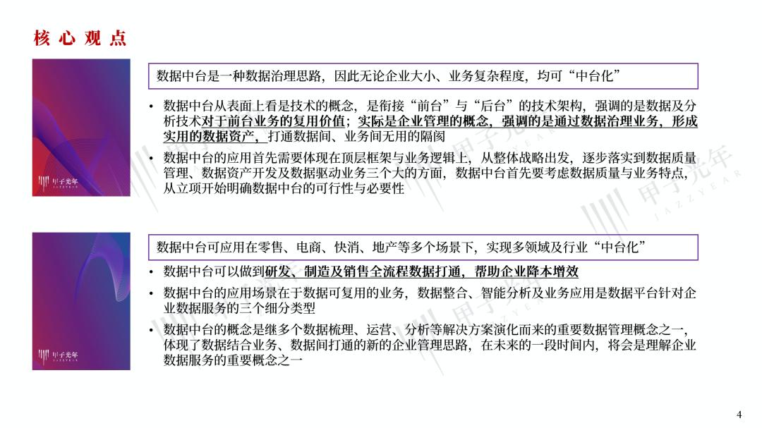 1.表面上看,数据中台是技术概念,是衔接“前台”与“后台”的技术架构,强调的是数据及分析技术对前台业务的复用价值;实际则是企业管理概念,强调的是通过数据治理业务,形成实用的数据资产,打通数据间、业务间无用的隔阂。