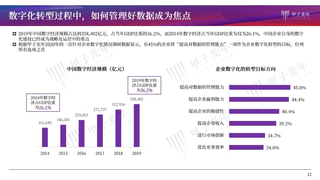 2019年,中国数字经济规模达到358,402亿元,占当年GDP比重的36.2%,而2014年数字经济占当年GDP比重为仅为26.1%,在数字经济发展的大背景下,企业自身的数字化建设和对数据的应用已成为企业战略、治理及运营的关注重点。