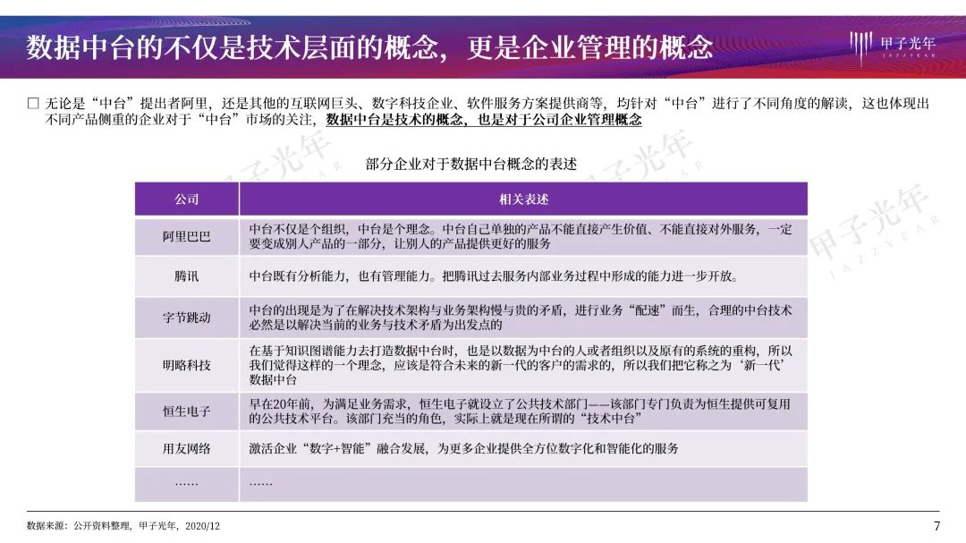 除阿里外,腾讯、字节跳动、明略科技及恒生电子等多家企业也都对数据中台给出了自己的解读与定义,这些解读虽各不相同,但都强调了数据及分析技术对于前台业务的复用价值。