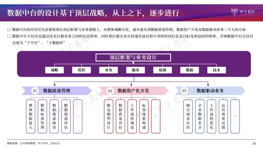 2.对数据中台的应用首先体现在顶层框架与业务逻辑上,从整体战略出发,逐步落实到数据质量管理、数据资产开发及数据驱动业务三大方面。