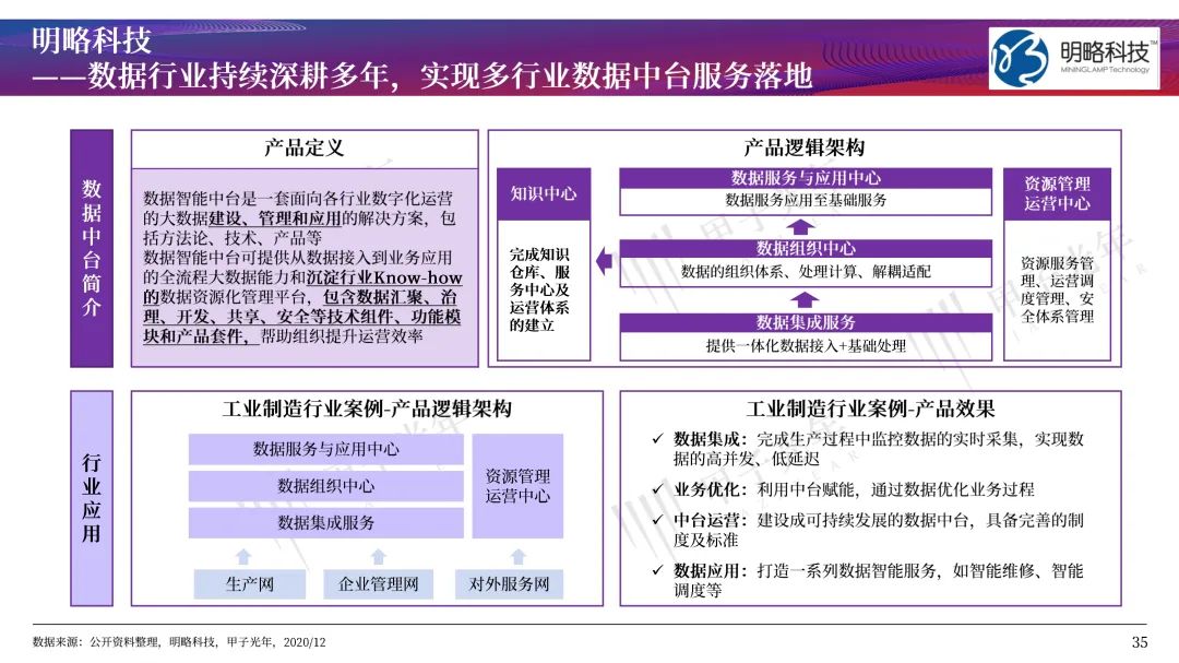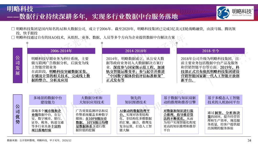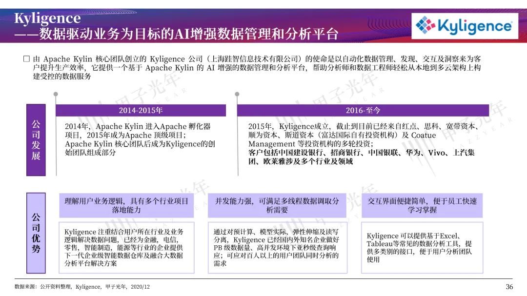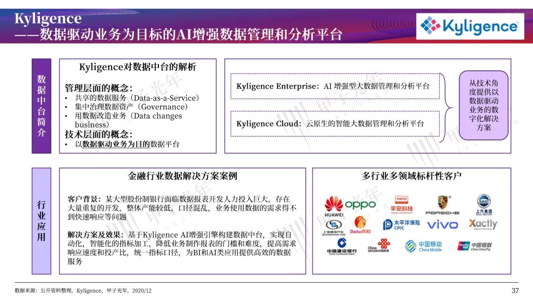 此次报告中,「甲子光年」智库研究、梳理了数据中台的定义、概况及企业案例,并以明略科技和Kyligence为例,介绍了数据中台企业的技术及业务优势。