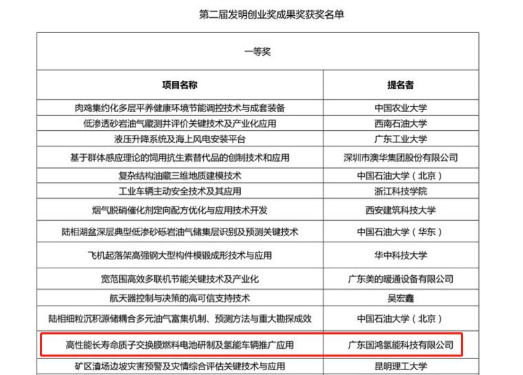 11月13日,中国发明协会在官网上发布了第二届发明创业奖成果奖公示,广东国鸿氢能科技有限公司(以下简称“国鸿氢能”)提交的关于“高性能长寿命质子交换膜燃料电池研制及氢能车辆推广应用”项目荣获一等奖。