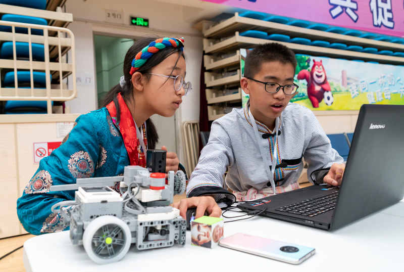 5月29日,两名参赛学生通过电脑调整机器人程序。