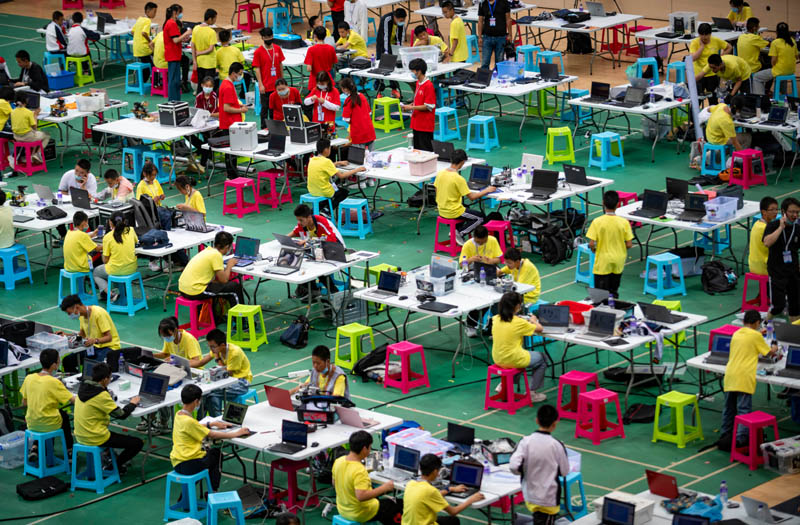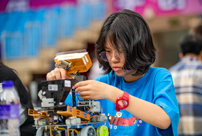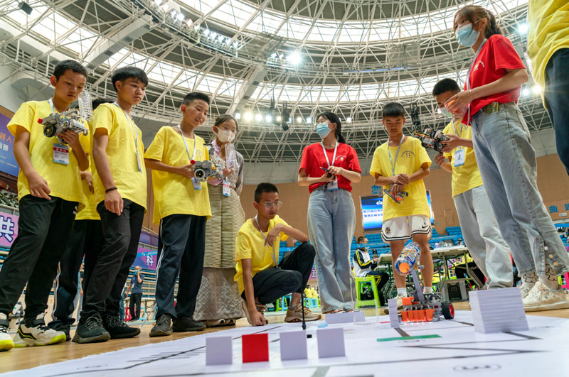 5月29日,参赛学生在比赛待赛区调试机器人。