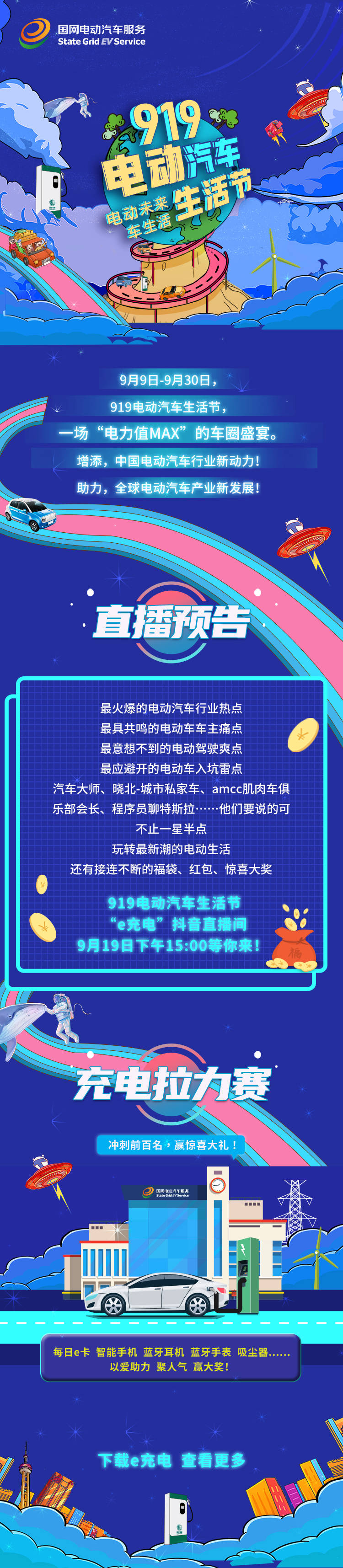 为提升活动的互动性和趣味性,在9月19日,国网电动汽车服务有限公司将邀请多位大咖做客“e充电”抖音直播间,和车友们共同探讨和碰撞时下最热门的新能源汽车话题和观点,直播间还会有接连不断的福袋、红包和各种惊喜大奖送出,可谓是电动车主们的盛大狂欢。