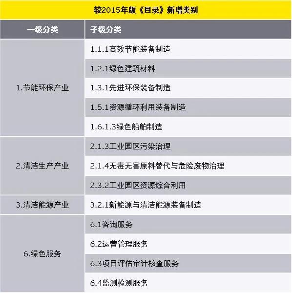 与《绿色债券支持项目目录(2015年版)》相比,在类别划分和涵盖范围上有较大变化。比如,新版《目录》将节能、污染防治整合到节能环保产业这一大类中;资源节约与循环利用对应至清洁生产大类;清洁交通整合到基础设施绿色升级大类;生态保护和适应气候变化整合到生态环境产业大类;与此同时新增绿色服务这一大类。
