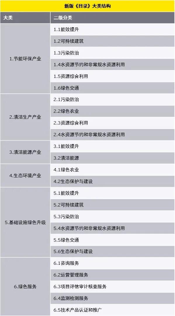 新版《目录》共有6个一级目录、25个二级目录、48个三级目录、204个四级目录。四级目录已经具体到项目名称,并附带对该项目的说明或条件。具体内容方面,新版《目录》做了深入细化的分类,主要沿用《绿色产业指导目录(2019年版)》的结构,6大领域分类保持一致。其中,一级分类包括节能环保产业、清洁生产产业、清洁能源产业、生态环境产业、基础设施绿色升级、绿色服务六大类。