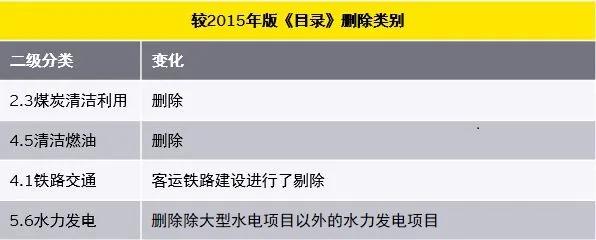 与2015年版《目录》相比,新版《目录》删除了化石能源清洁利用等具有较大国际争议的类别,不再包含煤炭清洁利用和清洁燃油类别;铁路交通部分将客运铁路建设剔除,仅保留货物运输铁路建设运营和铁路节能环保改造;水力发电部分仅保留大型水电项目。