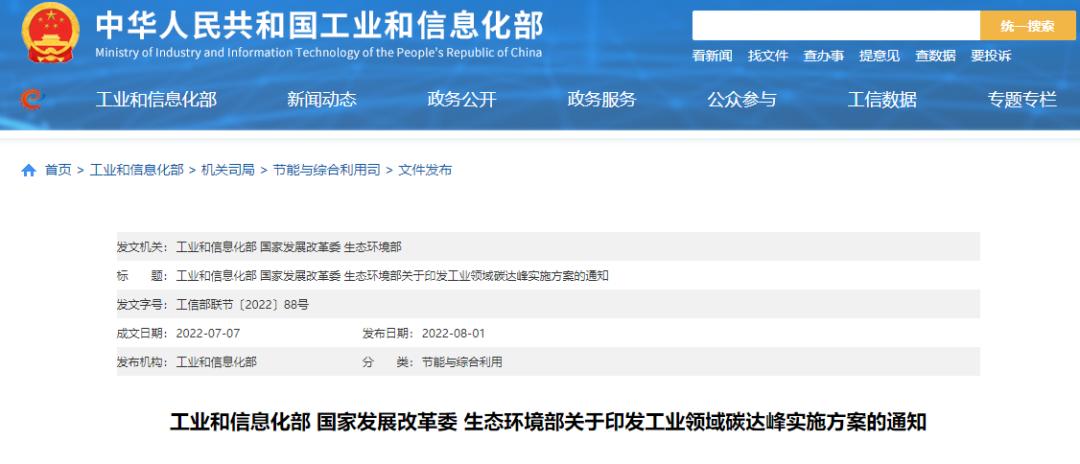 8月1日,工信部、国家发改委、生态环境部发布《工业领域碳达峰实施方案》。