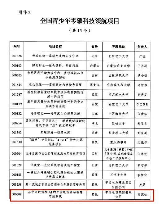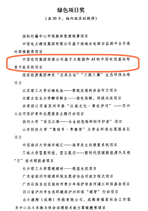 日前,全国第十届“母亲河奖”评选结果揭晓,《基于大数据和AI的中国电信基站智慧节能系统》项目代表中国电信集团获得绿色项目奖,此前该项目获评“全国青少年零碳科技领航项目”,从而成功进入“母亲河奖”优秀项目遴选库,最终斩获该大奖。
