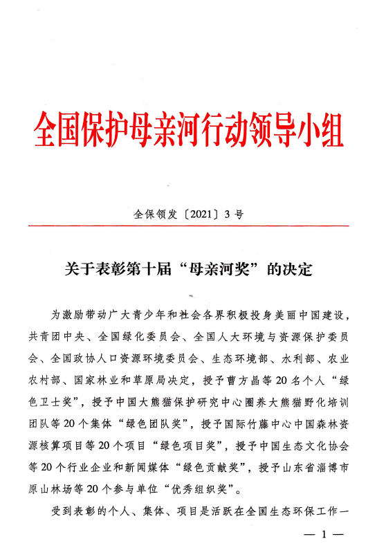 “母亲河奖”是全国保护母亲河行动领导小组(由共青团中央、全国人大环境与资源保护委员会、全国政协人口资源环境委员会、全国绿化委员会、生态环境部、水利部、农业农村部、国家林业和草原局等八部委共同发起成立)在生态环境领域设立的大奖,是我国生态环保领域的权威奖项。该奖项每两年评审一次,旨在表彰一批在国家生态文明建设领域和生态环保事业方面做出突出贡献、产生重要影响的个人、集体、组织和项目。