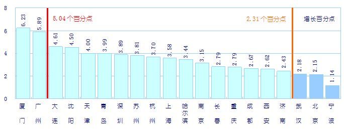 与上年比较,20个城市的创新总指数均高于上年水平(见图1-2),厦门和广州2个城市的增幅高于城市平均增幅(城市创新总指数比上年提高了5.04个百分点)。除武汉、北京和宁波以外,其他城市的增幅高于全国平均增幅(全国创新总指数比上年提高了2.31个百分点)。