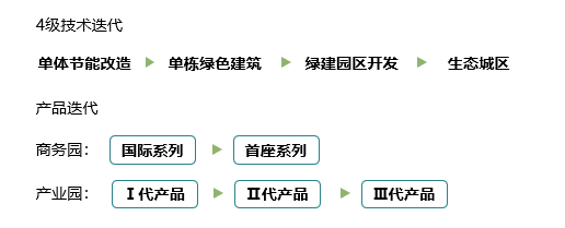 中节能实业的产品线,以绿色建筑为核心主业,积极开展绿建相关技术产品研发、设计、制造以及相关技术咨询服务。纵观中节能实业的发展脉络,实现了从一栋楼到一个园再到一座城的战略升级和创新模式。支撑中节能实业实现战略跃升的是历经的4级技术迭代和商务园、产业园的数次产品迭代。
