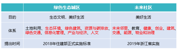 2019年,浙江省政府提出未来社区的概念,在理念上与绿色生态城区有着异曲同工之处。两者的目的高度一致,都是为了满足人民美好生活向往为根本目的,未来社区的九大场景与绿色生态城区的八大体系基本全部吻合。