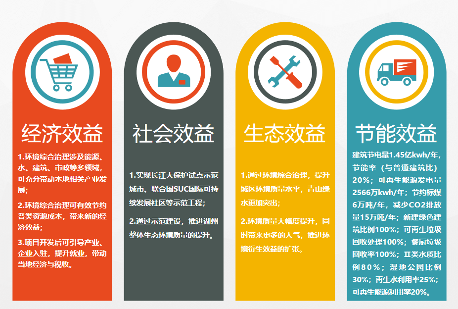 中节能·湖州绿色智造生态科技城,按照“186”规划目标建设,即打造一座生态城,融入八大生态系统,总投资600亿。建成后,每年节约用电量可超过1.7亿度,减少二氧化排放量每年15万吨,相当于种树820万颗。同时有效引导产业企业入驻,提升就业,探索出一条“生态优先、绿色发展”的新路子,形成经济效益、社会效益、生态效益、节能效益协同发展的绿色生态城区示范区。