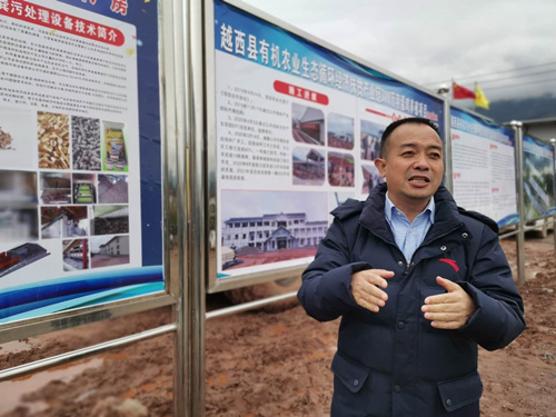 越西县有机农业生态循环经济产业链300万羽蛋鸡养殖项目负责人黄开金向记者介绍项目进展情况。人民网 吴兆飞摄