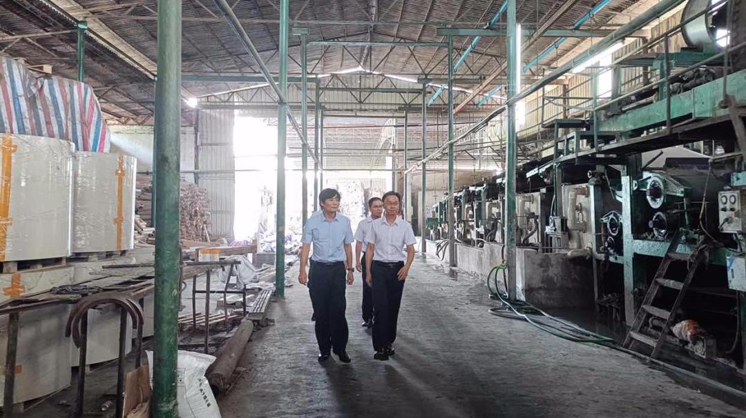 图为新兴农商银行员工走访加工制造企业