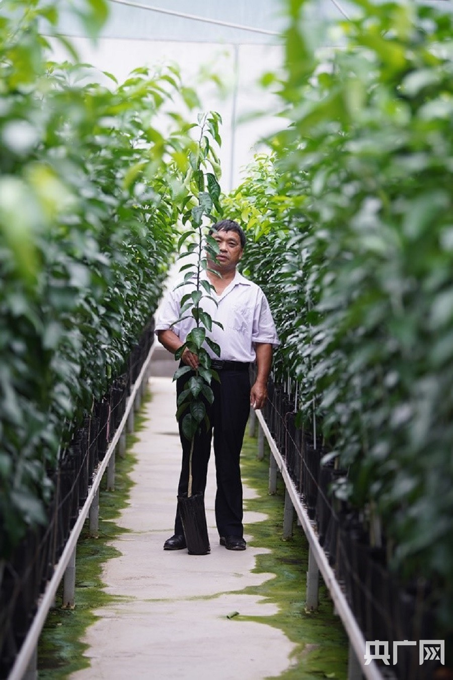 黄会明正在检查贡柑苗。(央广网记者 官文清摄)