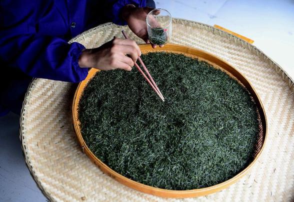 3月31日,一名工人在初选“恩施玉露”茶的粗块。新华社发(杨顺丕摄)