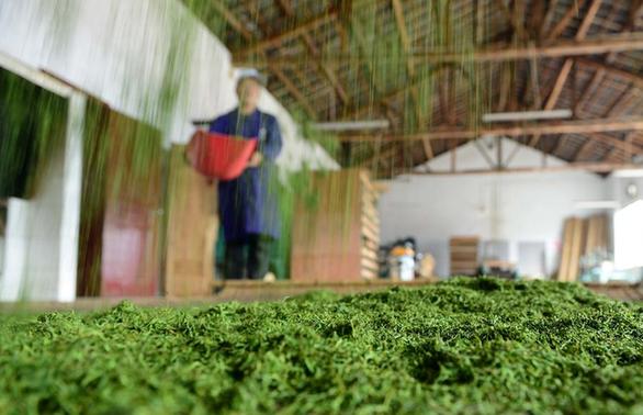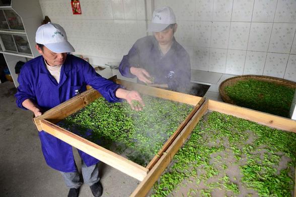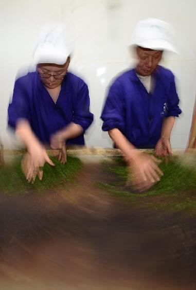 3月31日,工人将杀青后的茶叶进行摊晾散热。新华社发(杨顺丕摄)