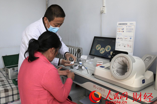 在于营村卫生室“健康小屋”内,张秀芝正在村医的帮助下体检。人民网 黄盛摄