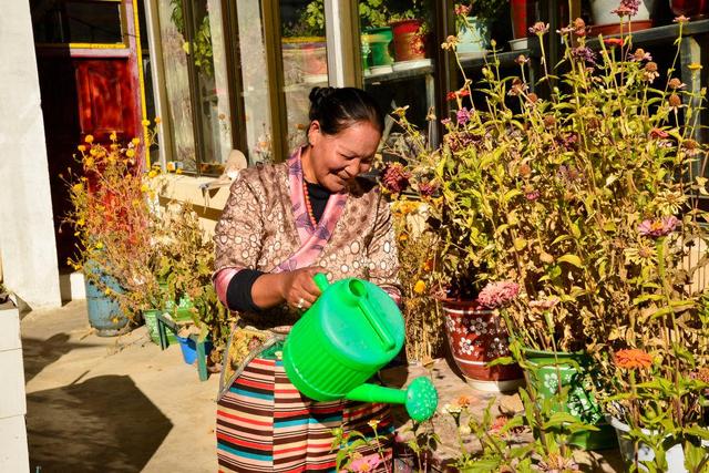 阿里地区札达县札布让村村民金珠德吉在院子里浇花。(2020年10月16日 摄 新华社记者 田金文 摄)