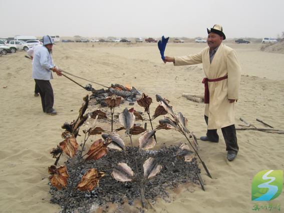 这里最有特色的是新疆的特色小吃——烤肉。而罗布人村寨的烤更具特色。它是用新疆特有的人称沙漠卫士的红柳串起来烤的。味道特别香,既有普通羊肉串的香味,又有红柳的清香,让人吃了回味深长。还有古法烤鱼,沿鱼腹剖开但鱼脊相连,用细的红柳枝将鱼展平,像插上新的肋条,粗红柳枝一端沿鱼脊肉穿过,另一端就插在沙土里。像是张开了翅膀的鱼压弯了红柳,正好被一小堆燃烧的枯胡杨烘烤。“除了盐,要是撒了其他调料,就不是罗布人的烤鱼”。