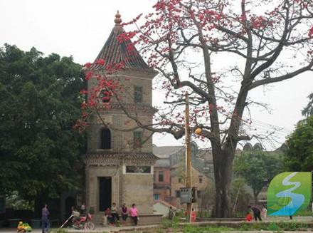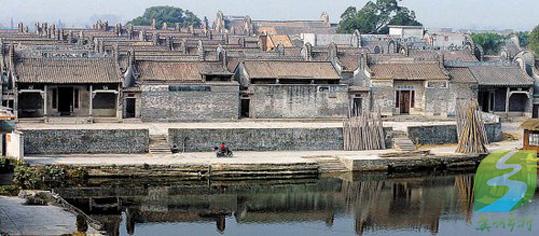 三水乐平大旗头村最突出的一座建筑是"振威将军家庙",主人是清代的一员武将。家庙前临半亩方塘,汇集整个村的地下水,取四水归塘之意。塘基砌以石坎,突出部分形如壶嘴,塘边建一个笔形古塔,名文塔。塔下有两方石,大者高3尺许,形如砚,小者方块状如印,形成一组"文房四宝"的景观。该村的建筑群密集而规整,内部布局是当地常见的三进深院落,外部以小巷分隔,纵横交错如棋盘。内巷均以条石铺砌,排水眼都统一凿成钱眼的模样,排水孔下连"渗井",泄入暗渠,流进池塘,地下排水系统相当合理。