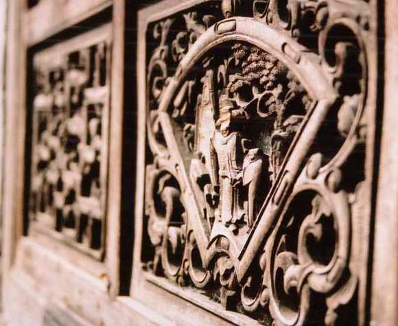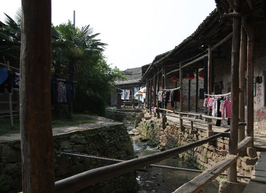 从高处眺望,四面青山围绕着一片屋宇,渭溪河迂回曲折穿村而过,河上大小石桥47座。屋宇墙檀相接,参差在溪流之上,形成“溪自阶下淌,门朝水中开”的格局。傍溪而铺的是一条长廊,廊里铺有一条青石板路,沿途通达各门各户,连接每一条巷口,巷道纵横交错,通达每个厅堂共有60条,最长的巷道有153米,居民们在此起居可以“天晴不曝晒,雨雪不湿鞋”。图案有喜鹊、梅花、猛曾之类,栩栩如生。