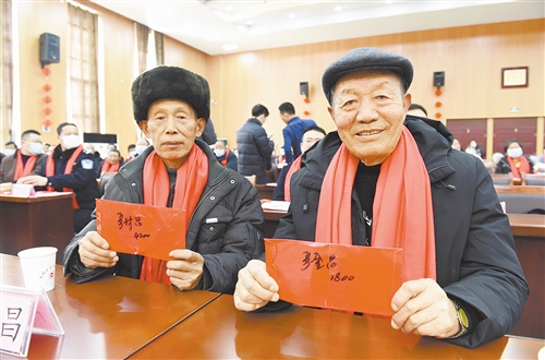 图② 安徽省滁州市凤阳县小岗村,“大包干”带头人严金昌(右)和严付昌展示自家领取的集体经济收益股权分红。(新华社发)