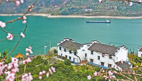 图① 在三峡库区湖北省宜昌市秭归县屈原镇西陵峡村,脐橙园里鲜花盛开。(新华社发)