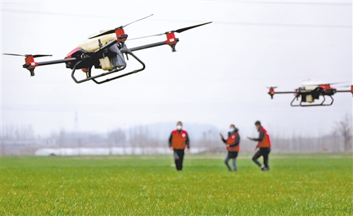 图③ 在山东省枣庄市野岗埠村,工作人员使用植保无人机在麦田里喷洒除草剂。(新华社发)