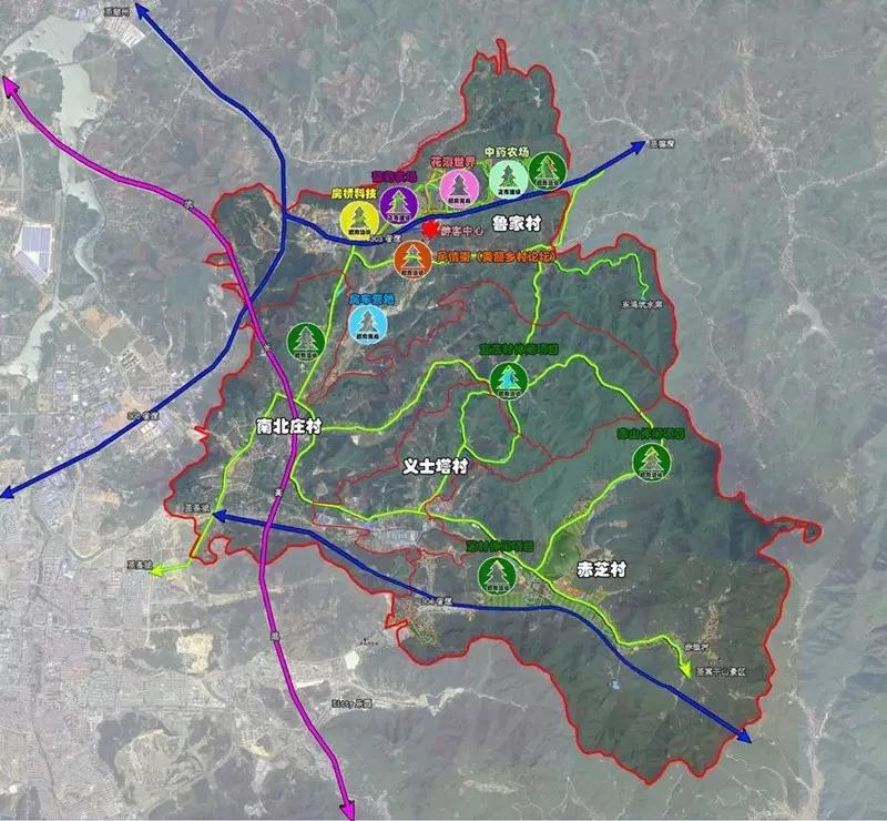 “岭上家园”——创意农业休闲度假区为辐射带动区,主要分布于南北庄、义士塔2个村,以打造岭上农场——岭上湖居——岭上乡居三个主题板块为主;