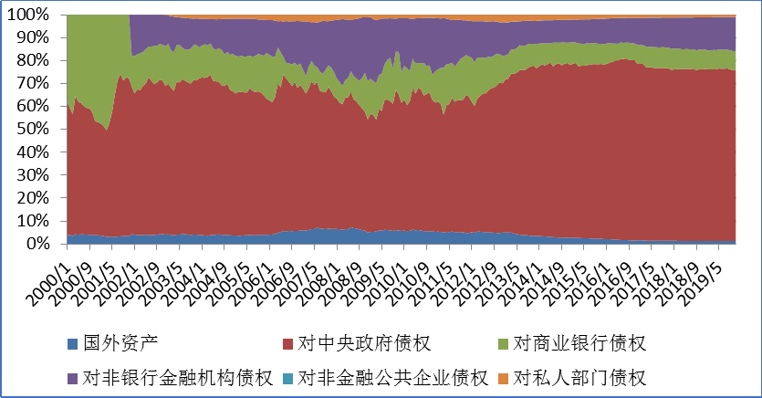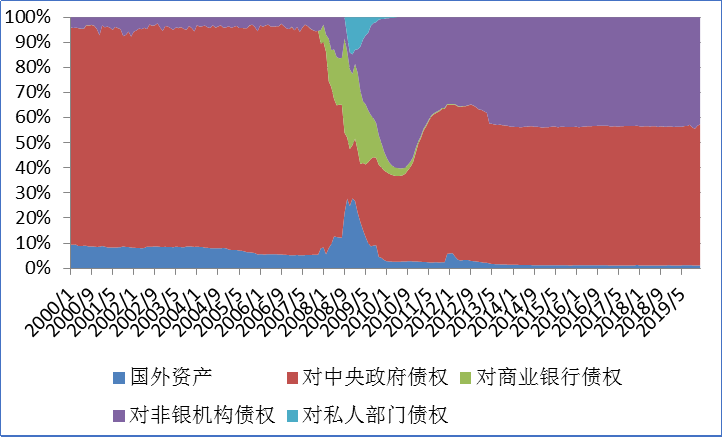 日本央行从2000年开始实行量化宽松货币政策增加的就是商业银行债权,此后又增加了对非银行金融机构和私人部门的债权,对政府债权的比重是波动的。