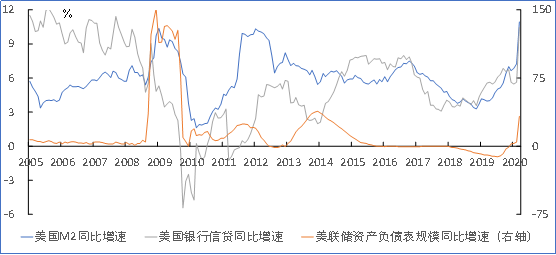 1)2008年9月美联储为救助金融机构,买进非金融机构的金融资产,资产急剧扩张,此时银行的贷款能力和意愿尚未消失,于是出现了美联储资产、银行信贷和货币供应量M2同时增长的情况。此后银行信贷同比增速急剧下降到2009年10月的-5.4%,直到2011年下半年才恢复稳定增长。