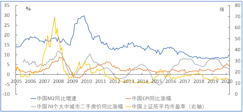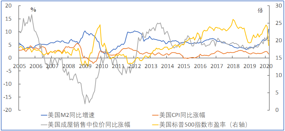 2008年9月后,美国由于金融危机的影响,尽管M2增长超出以往,但CPI、房价(美国成屋销售中位价同比涨幅)、股市市盈率(美国标普500指数市盈率)一齐下跌。2011年经济平稳后CPI涨幅逐步下降,但房价和股市市盈率均开始上升,直到2019年底股市市盈率均有较好的增长。