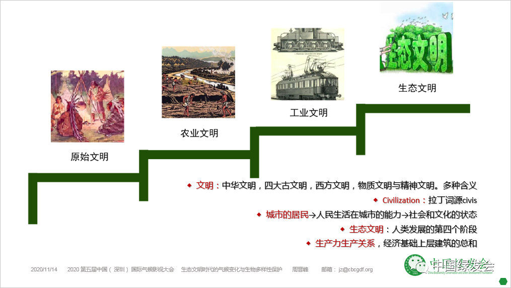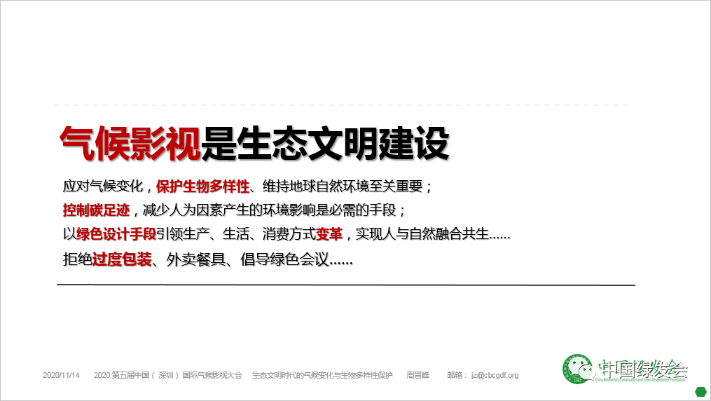 如何深刻学习习近平生态文明思想?生态文明建设包括什么?人类应该如何应对气候变化并加强生物多样性保护?在11月14日召开的2020年第五届中国(深圳)国际气候影视大会上,周晋峰应邀在主论坛——“气候变化与绿色复苏”做主旨演讲,演讲的题目为“生态文明时代的气候变化与生物多样性保护”,就上面三方面问题进行细致讲解。